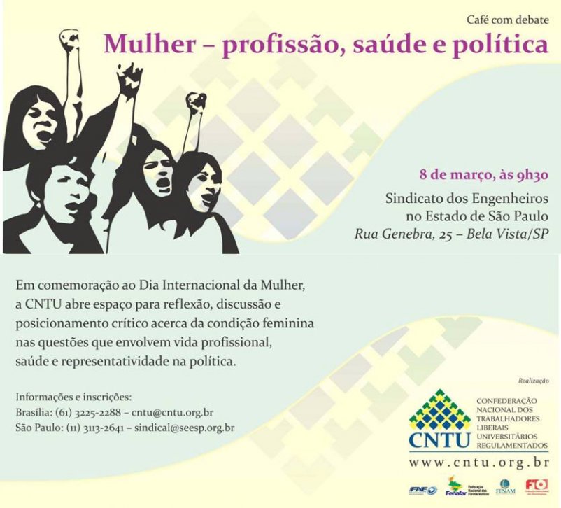 Como parte das atividades, a CNTU inicia, a partir de hoje, a cobertura especial de março sobre a condição das mulheres da socieldade brasileira, a organização e atuação das profissionais que atuam nas entidades da confederação e suas agendas prioritárias de luta.