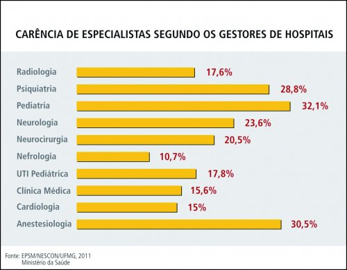 Atualmente, são ofertadas 1.258 de residência médica. Também foram anunciadas, na semana passada, mais 1.270 bolsas de residência multiprofissional. Além de melhorar o atendimento, o objetivo é formar profissionais nas áreas de maior carência de quadros, segundo as informações dos hospitais credenciados (veja gráfico).