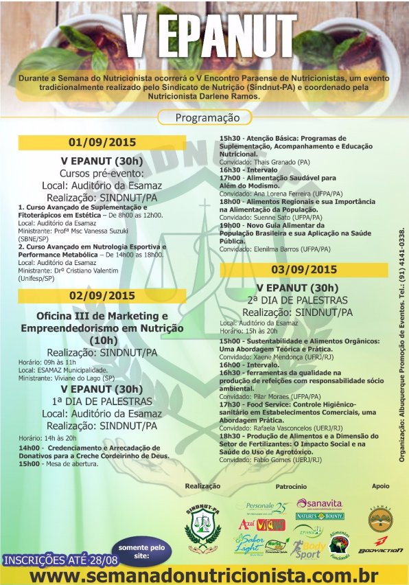 De terça a quinta, nutricionistas do Pará se reunem na Escola Superior da Amazônia (Esamaz), em Belém, para realizar a quinta edição do Encontro Paraense de Nutrição (V Epanut), promovido pelo Sindicato dos Nutricionistas do Pará (Sindnut-PA).