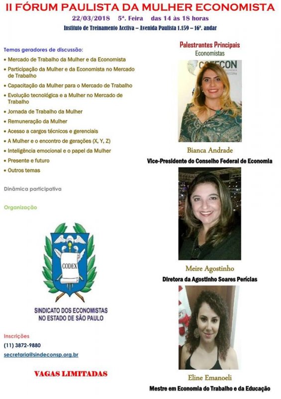 O II Fórum Paulista da Mulher Economista ocorrerá na quinta-feria (22/3), entre 14h e 18h, no Instituto de Treinamento Acctiva, localizado na Avenida Paulista, 1159, 16º andar. As inscrições ainda podem ser feitas pelo telefone 3872-9880 ou pelo email O endereço de e-mail address está sendo protegido de spambots. Você precisa ativar o JavaScript enabled para vê-lo. . Vagas limitadas.