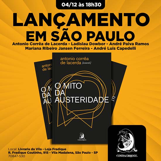 Com coordenação de Antônio Correa de Lacerda, que integra o Conselho Consultivo da CNTU, será lançado no dia 4 de dezembro, às 18h, o livro “O mito da austeridade”, pela Editora Contracorrente, na Livraria da Vila, em São Paulo (SP). Com textos de Ladislau Dowbor, André Paiva Ramos, Mariana Ribeiro Jansen Ferreira, André Luis Campedelli e do próprio coordenador, a obra busca debater os malefícios que a política econômica praticada nos últimos anos no Brasil gera para a sociedade como um todo.